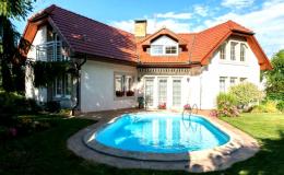 Современный новый дом с двумя отдельными входами, открытым бассейном, гаражом, сауной и видом на лес расположен в тихом и чистом районе на окраине