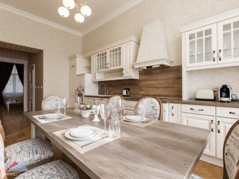 Дизайн с теплыми оттенками придает интерьеру уютную и приятную атмосферу. Квартира полностью оборудована-кухня, встроенные шкафы и вся мебель. Пол квартира покрыт дубовым паркетом. В квартире есть роскошные шторы и занавеси, сделанные по мерке, роскошные виниловые обои, люстры в стиле барокко и Ренессанс, все дополнено подлинными антикварными картинами 30-х годов. Вся квартира производит эффектное впечатление.