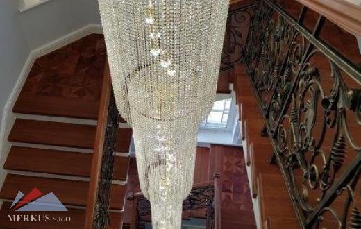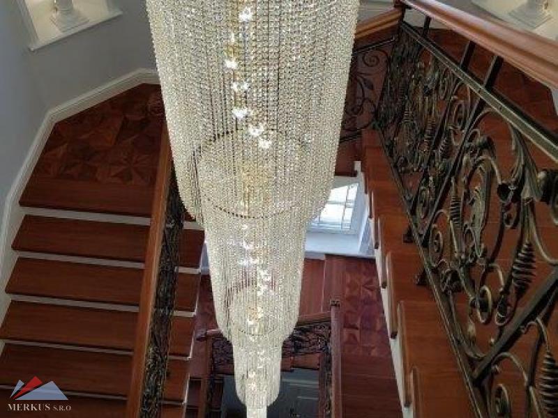 На втором этаже, на который ведет деревянная лестница с ковкой ручной работы, находится кухня, презентабельная зона с мраморным камином, библиотека, спальня, две ванных комнаты, балкон. Стильная лестница украшена впечатляющей семиметровой хрустальной люстрой.